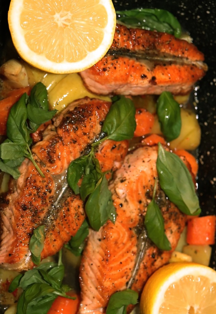 Salmon Vegetables Basil And Lemon. This dish is so easy to make and has tons of flavor. Dice a few potatoes and a carrot. Slice a small red onion. Cut an apple in small pieces. Sprinkle a little oil, salt and crushed green peppers. Put these in the oven for 20 minutes. Sear the salmon on high heat 1 minute on each side. Then sprinkle salt, lemon pepper, dried thyme and dried tarragon on the salmon. Add the salmon on the vegetables. Add lemon halves and basil leaves. Put the dish back in the oven for 10 minutes. Quick and easy. Healthy, nutritious and delicious.