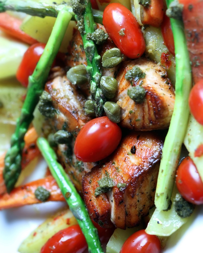 Divide the potatoes, carrots and asparagus between two plates. Add the salmon and the tomatoes to the plates. Decorate with lemon slices, capers and green pesto for extra flavor!