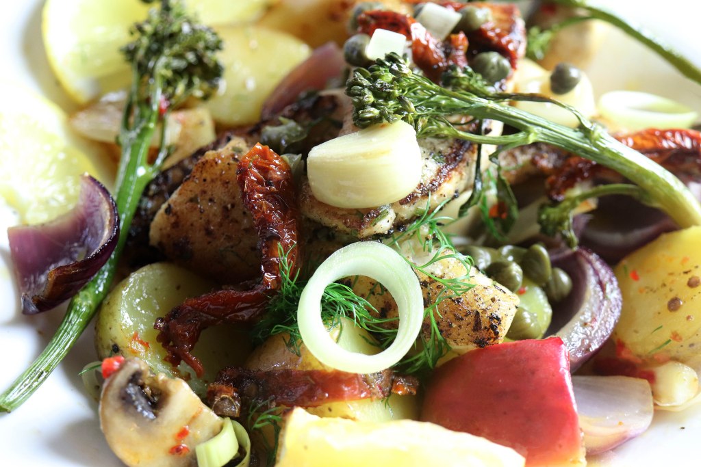 This is one of my favorite dinner dishes. The pike-perch is lean fish. The potato, apple, mushroom, garlic and onion mixture is tasty and nutritious. Leek, sun-dried tomatoes, capers, lemon and broccolini make this dish extra yummy. The dish is filled with vitamins. Dill, lemon pepper, tarragon and chili are terrific for seasoning this dish.