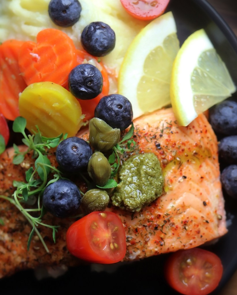 If you love salmon, potatoes and blueberries, this exotic dish is for you. This dish has tons of flavor and lots of vitamins. The capers and green pesto give extra lovely flavor to the fish. This dish is quite easy to do!