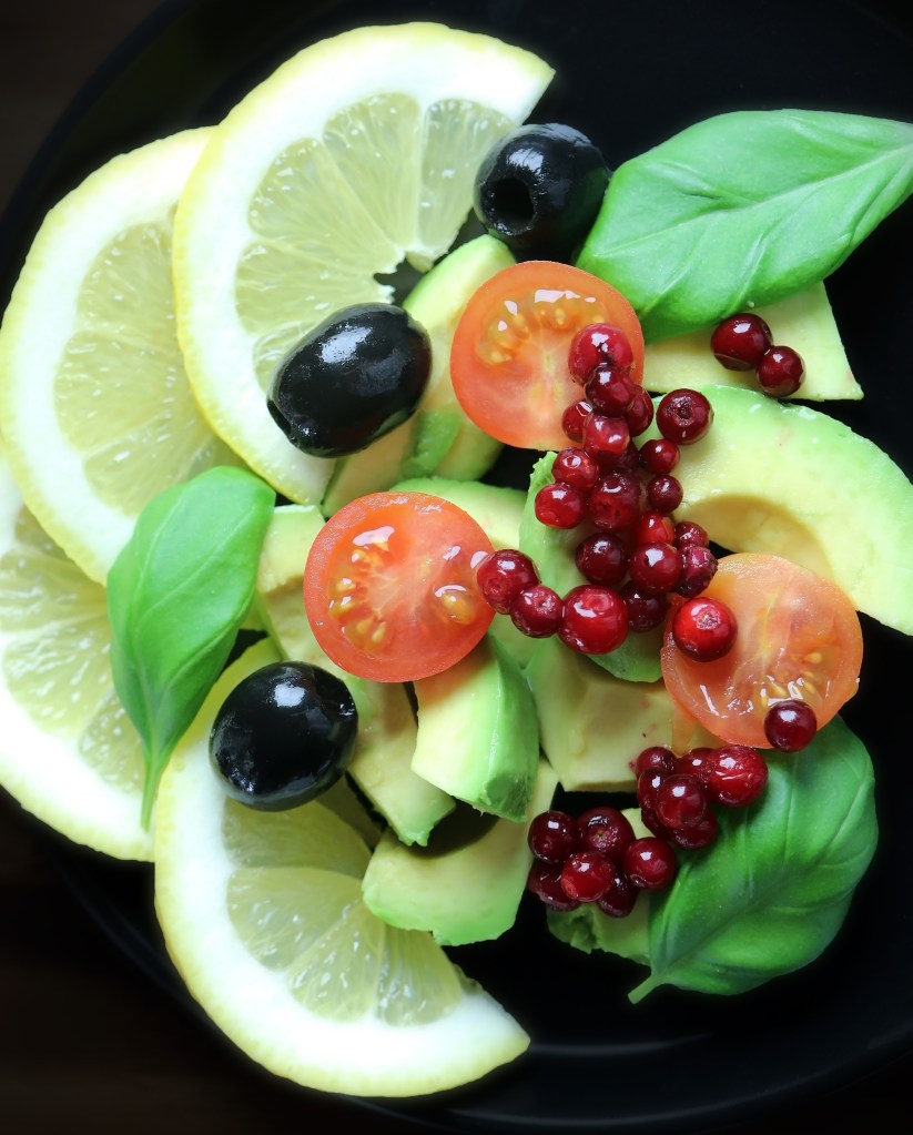 Wash the lemon and cut half of it into slices. Cut the avocado in half, remove the stone, and use a spoon to get the avocado off the skin, then slice the avocado. Divide the avocado slices between two plates. Sprinkle juice of half a lemon on the avocado. Use the lemon slices to decorate the dish. Add olives and basil leaves on the avocado. Cut the tomatoes into halves and divide the tomatoes between the two plates.