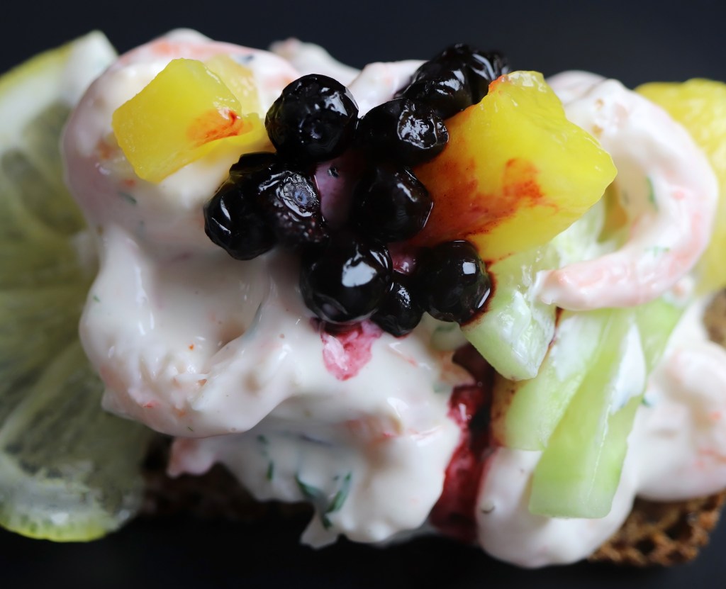 This dish is based on a very traditional Scandinavian dish. Toast with shrimp, dill and mayonnaise. It was created by a popular Swedish restaurateur, Tore Wretman, just after the second world war and named after a fishing port in Denmark. I wanted to create something new and decided to add cucumber, chili, mango and blueberries.