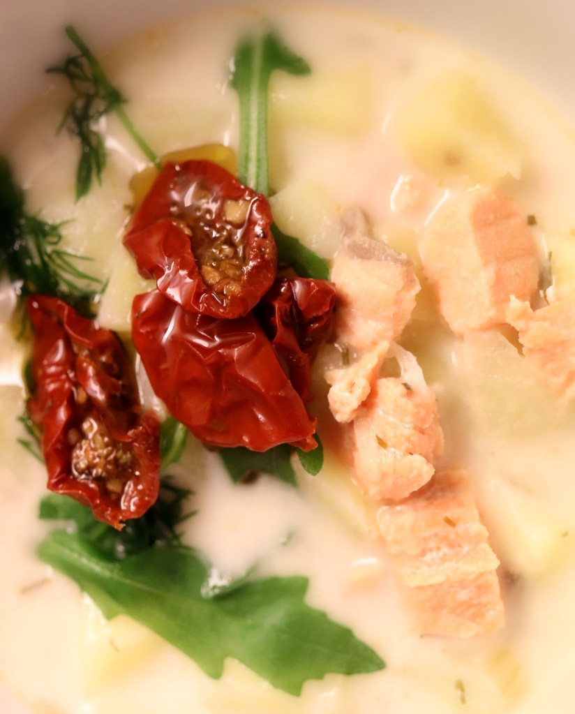 Salmon soup is so good and very healthy too. This one has a touch of chili, so it is lightly spicy, and very delicious. If you do not want to add chili, you can leave it out. As always, taste while cooking, as that is the only way to learn what you love the most. Be brave in the kitchen and have fun!