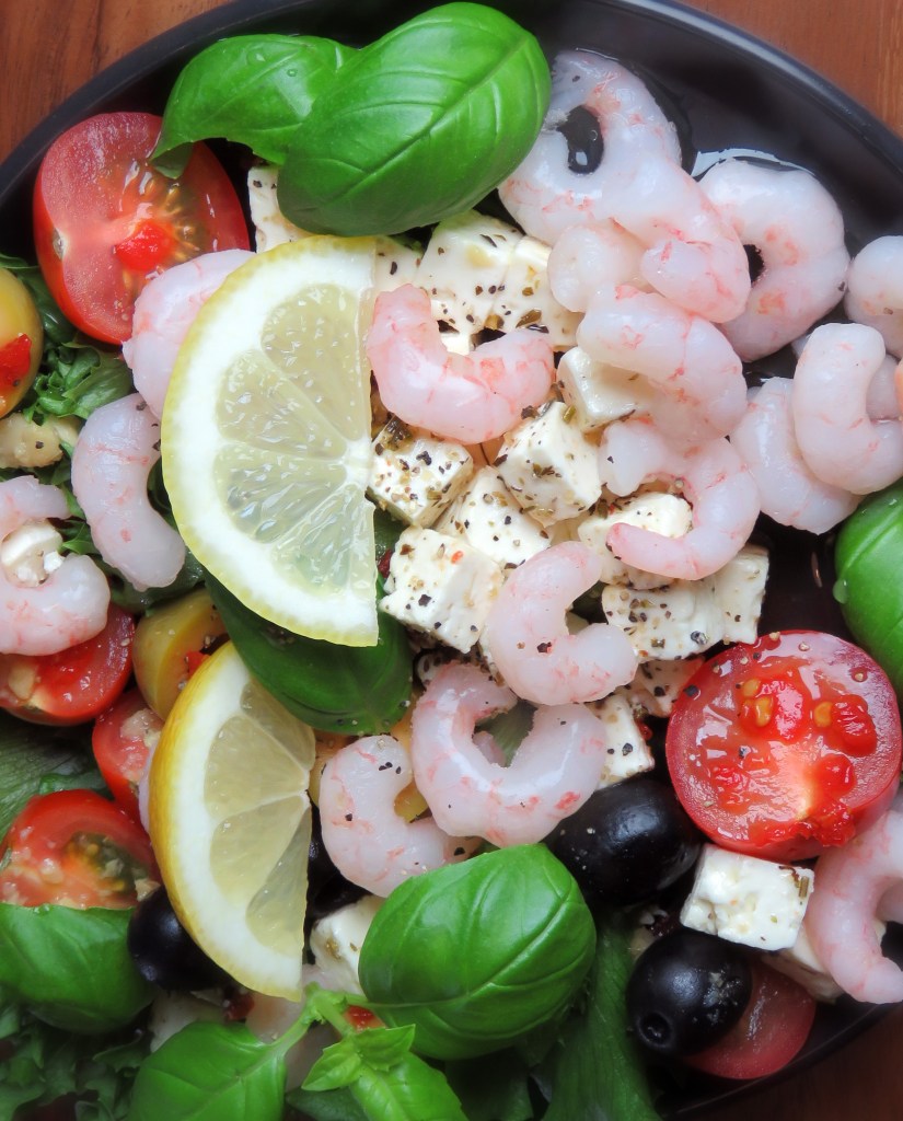 This shrimp, tomato and feta salad is a wonderful choice for a side dish for chicken or steak dinner. It is as hot as you make it. 🙂