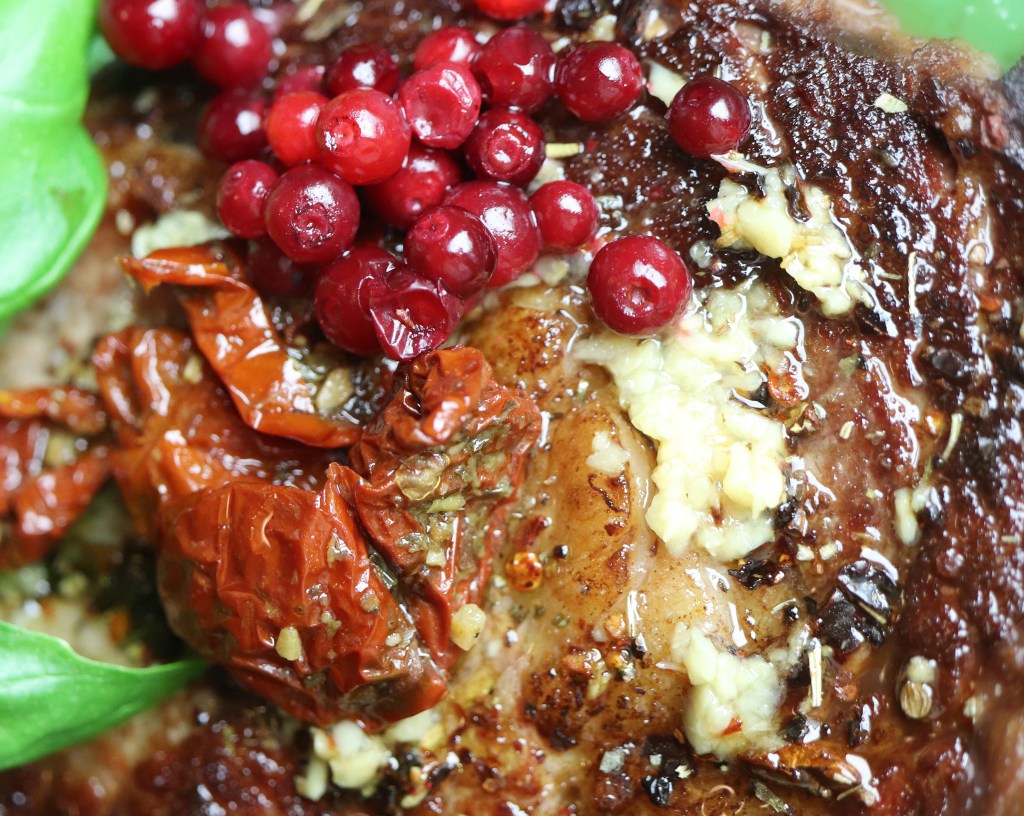 Place one entrecote steak on each dinner plate. Decorate with sun-dried tomatoes, lingonberries and basil leaves.