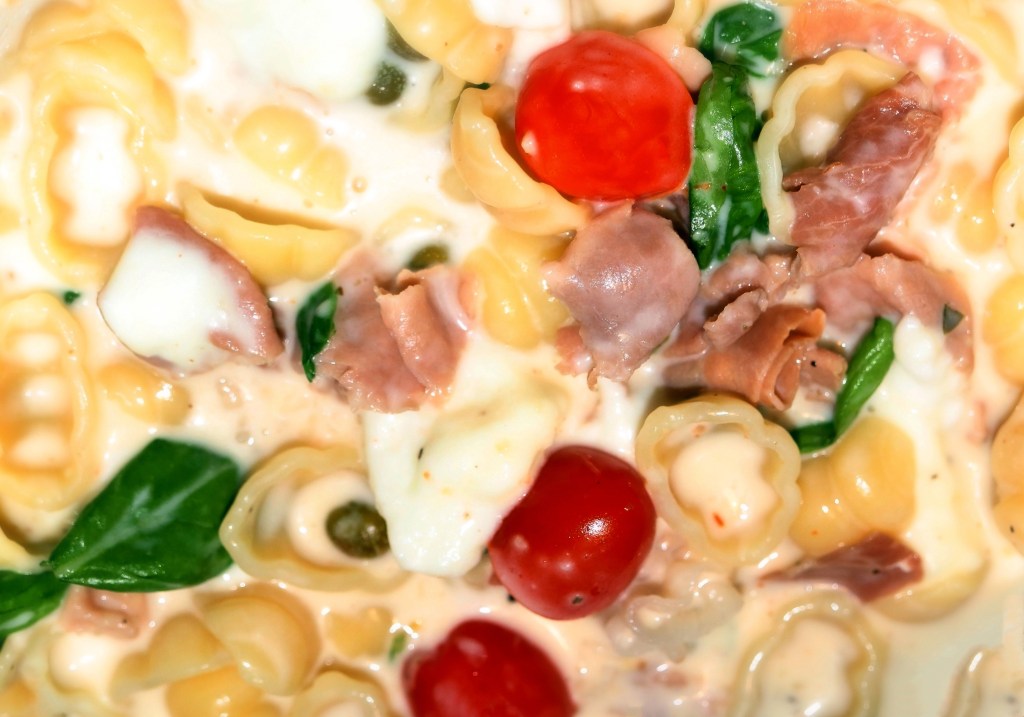 If you like pasta and mozzarella cheese, this is a great recipe for you. With low-fat cream this dish is healthy, nutritious and delicious. If you cannot find Italian prosciutto, choose any dry-cured ham you can find in your store.