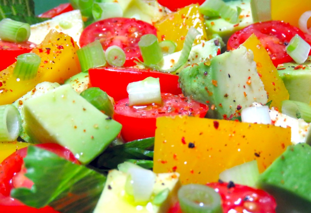 Wash the tomatoes, cut them in half and add them on the plates. Wash the scallions and cut them into slices and add them on the salad. Season with olive oil, Pasta Rossa spice and lemon pepper.