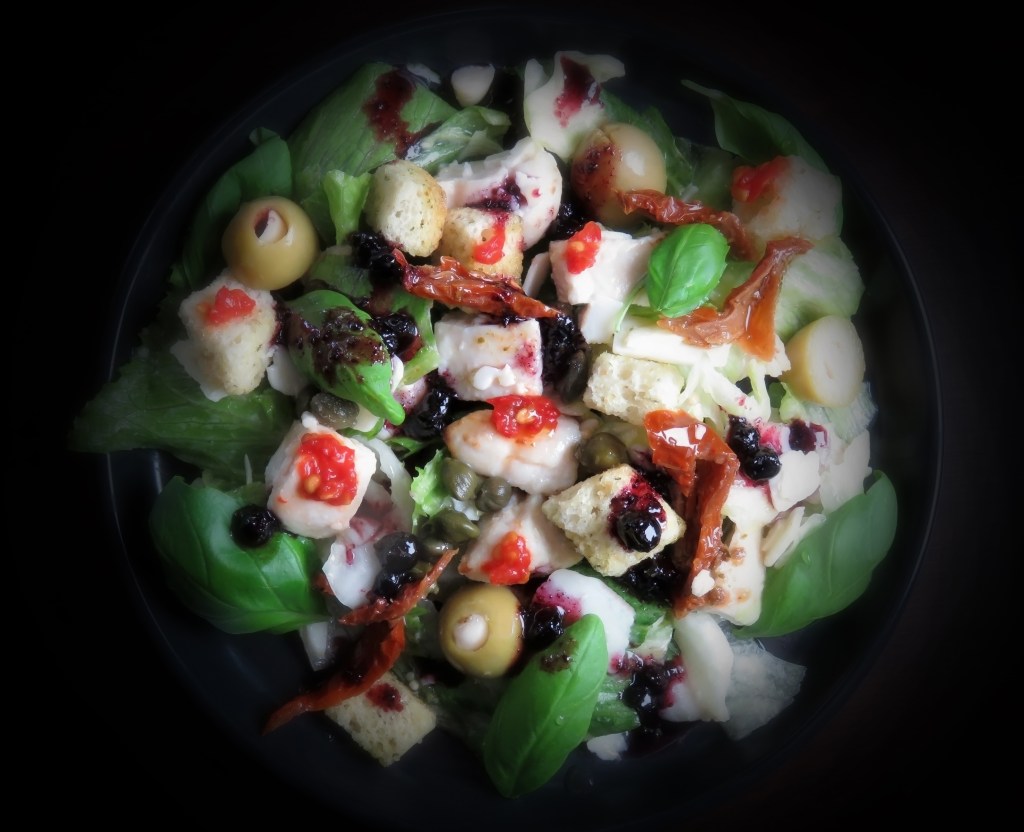 Slice the chicken inner fillets into 1/2″ pieces and cook these in oil on medium heat. Use a non-stick pan. Season with salt. Cook for 5 minutes and turn the pieces twice per minute. Divide the chicken between the plates. Add parmesan flakes, baby capers and basil leaves on both plates. Divide the olives between the plates. Add the sun-dried tomato slices. Season with chili paste and blueberry jam.