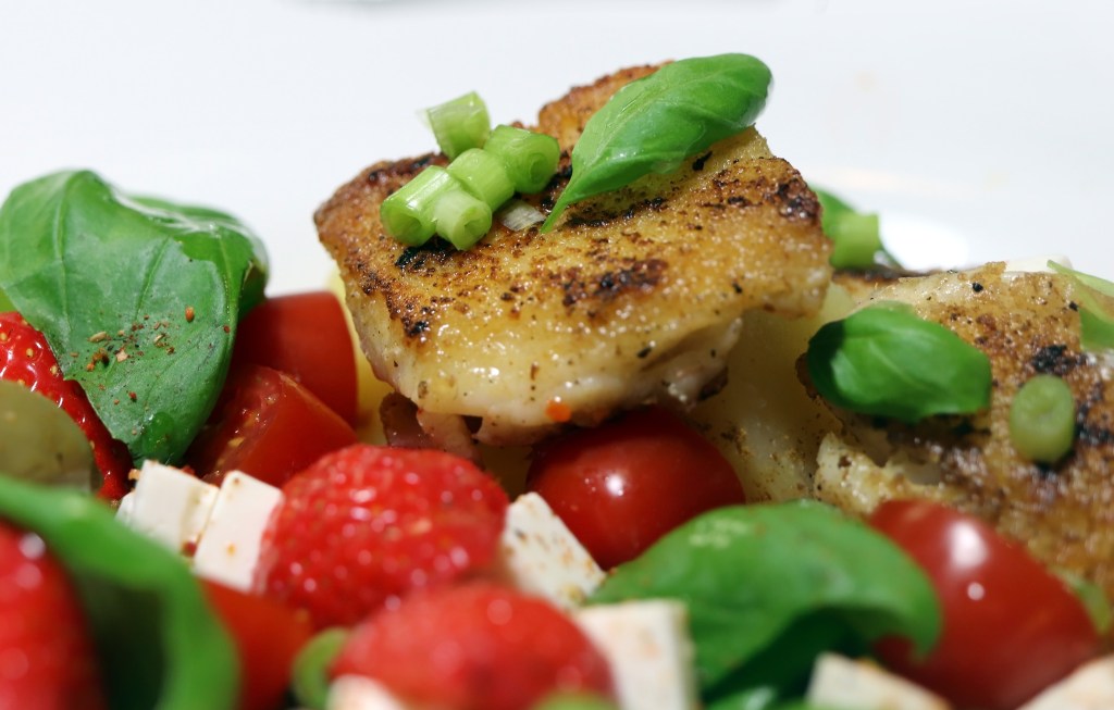 Wash the tomatoes and the strawberries. Cut them in half and divide them between two plates. Divide the feta cheese between the plates. Season with Pasta Rossa spice mixture. If you cannot find this spice, you can use dried thyme and dried garlic pepper.