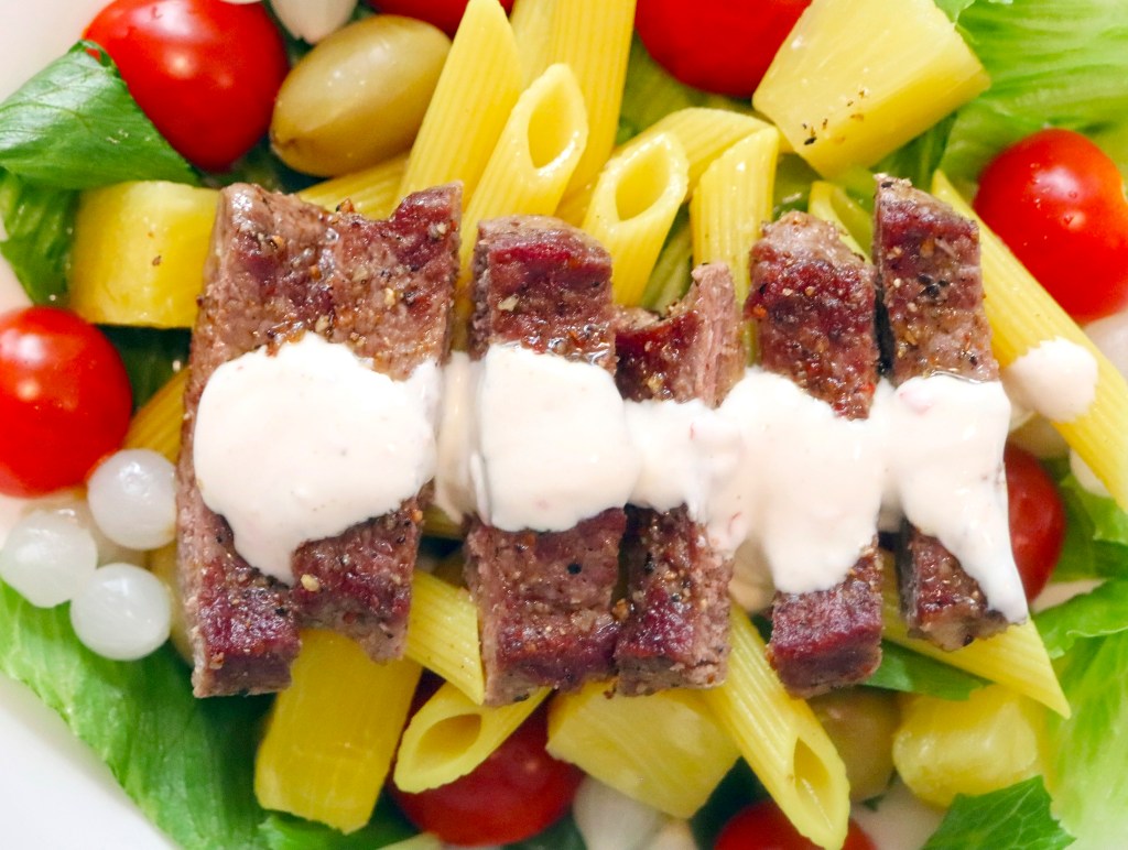 Drain the pasta and divide it between the two plates. Cut the steak into slices and add these on the pasta. Drizzle crème fraiche on the steak.