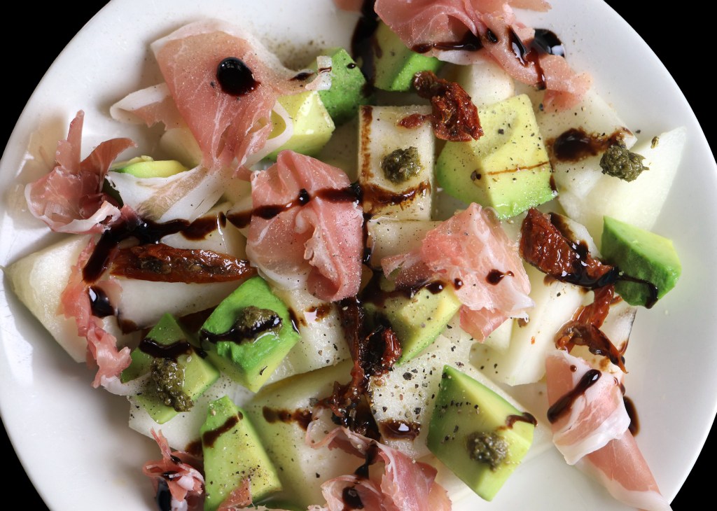 Cut the avocado in half. Use a spoon to remove the stone and to get the fruit off the skin. Cut the avocado into 1″ (25 mm) pieces. Cut the melon into 1″ (25 mm) wide slices and cut off the hard skin. Divide the avocado and the melon between two plates.