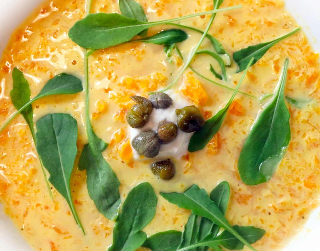 Divide the soup between two small soup bowls. Add asparagus leaves on top. Add creme fraiche and capers. Enjoy an exotic soup with lovely flavors.