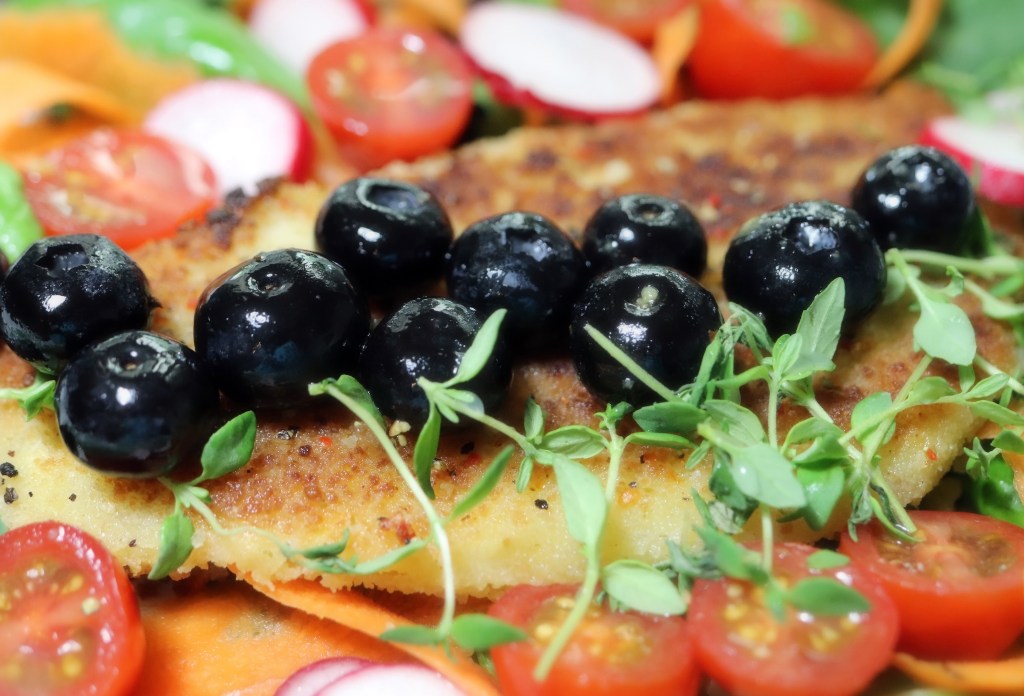This is a delicious lunch or a light dinner dish. The tomatoes, carrot and radish are nutritious and juicy. The blueberries give an exotic and lovely taste to the dish. Flounder is a mild white saltwater fish. If you cannot find it, choose another kind of white fish fillet.