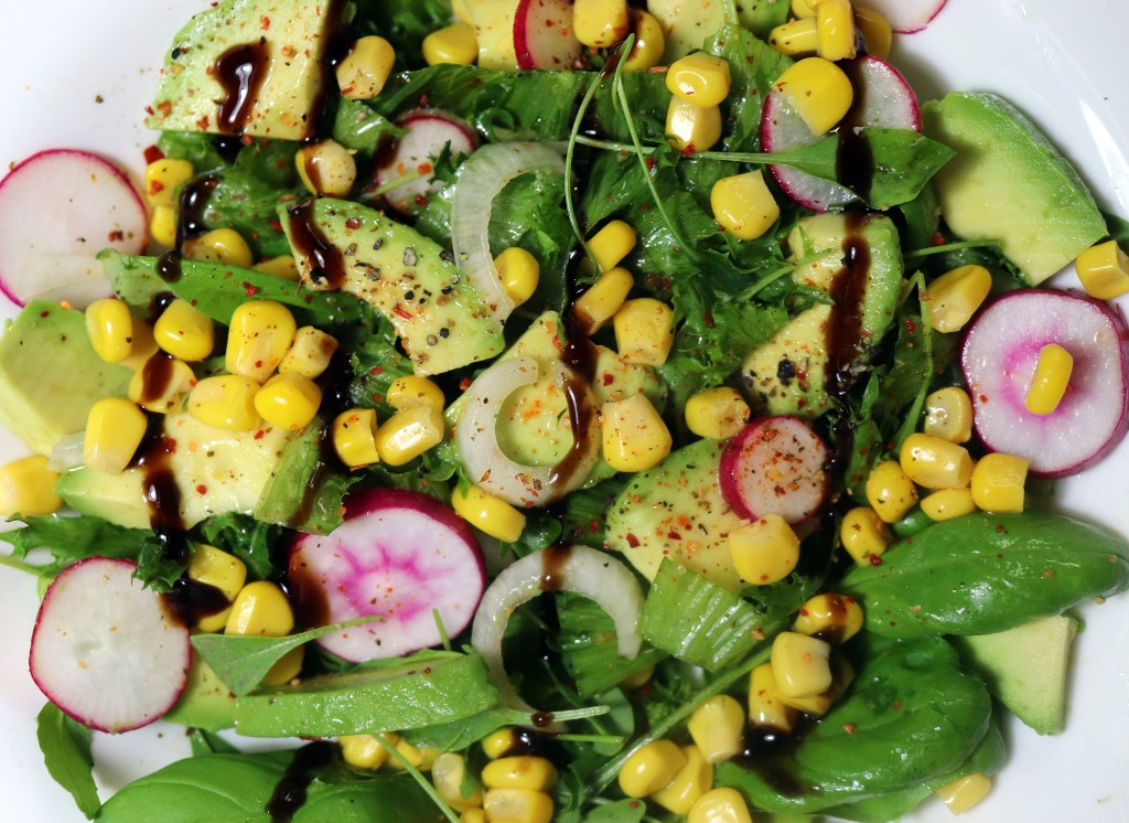 Divide the lettuce and avocado slices between two plates. Add onion rings and radish slices on both plates. Drizzle with lemon juice and olive oil. Add corn and arugula leaves on both plates. Season with lemon pepper and your choice of crushed spices. Divide the basil leaves between the plates. Drizzle balsamic glaze on the salad.
