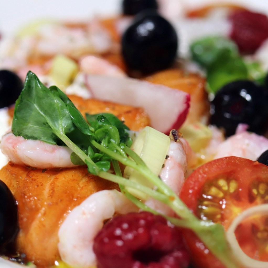 Add the salmon on the crème fraiche (sour cream). Wash the watercress. Add shrimp and watercress on the plates. Season with dried thyme. Add a lemon slice on each plate. Decorate with blueberries and raspberries.