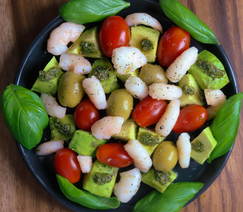 Cut the prawns in half and add prawns on both plates. You need 14-20 prawns for two salads. Add a few olives (green or black) on the plates and garnish with basil leaves. Basil smells and tastes so good, and is filled with vitamins and antioxidants.