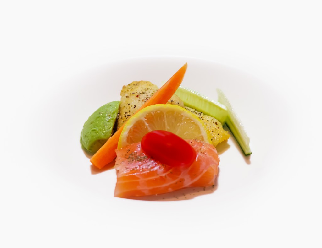 A healthy starter can be lean white fish, cured or cold smoked salmon, avocado, cucumber and carrot.